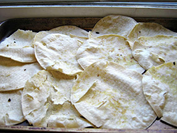 5. Spread tortillas out in a single layer over several large baking sheets (you'll need about 15 small tortillas total). Bake in oven until crisp and slightly browned, about 20 minutes. Remove from oven and let cool. Increase oven temperature to 350°.